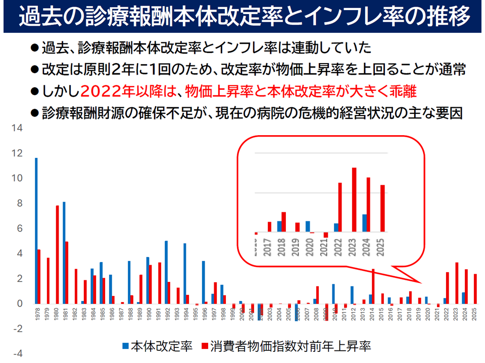 →2024年度診療報酬改定で措置されたよりも賃金・物価上昇が大きく、これを補填する必要がある