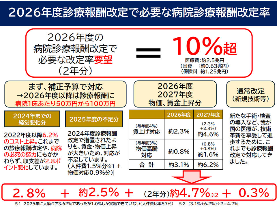 病院経営は極めて深刻な状態にあり、(1)2025年度補正予算で「1床当たり50-100万円」の病院経営支援を行う(2)2026年度に10%超の診療報酬プラス改定を実現する—必要がある。さもなくば病院経営が破綻し、国民が地域で安心して医療を受けられなくなってしまう—。