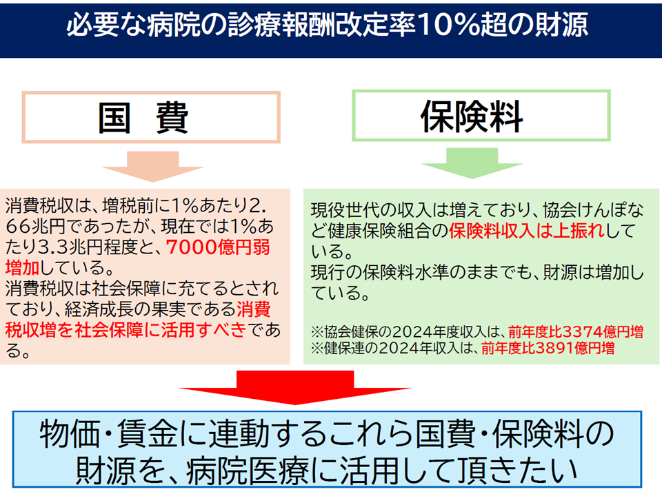 つまり、物価増等に伴う「消費税収の増加」、人件費増(=給与増)に伴う「健康保険料収入の増加」が生じており、「保険料率や税率の引き上げなどをせずとも、診療報酬の大幅プラス改定に必要な財源を確保できる」と病院団体が考えていることが分かります。
