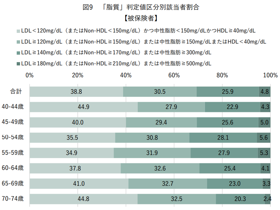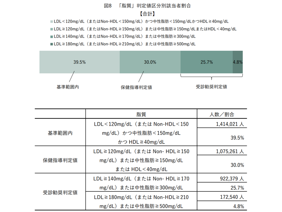 脂質については、基準範囲内(LDL120mg/dL未満・HDL40mg/dL以上・中性脂肪150mg/dL未満)は39.5%にとどまり、▼保健指導判定値以上(LDL120mg/dL以上、HDL40mg/dL未満、中性脂肪150mg/dL以上)が30.0%▼受診勧奨判定値以上が30.5%(LDL140mg/dL以上、中性脂肪300mg/dL以上が25.7%、LDL180mg/dL以上、中性脂肪1000mg/dL以上が4.8%)となりました。
