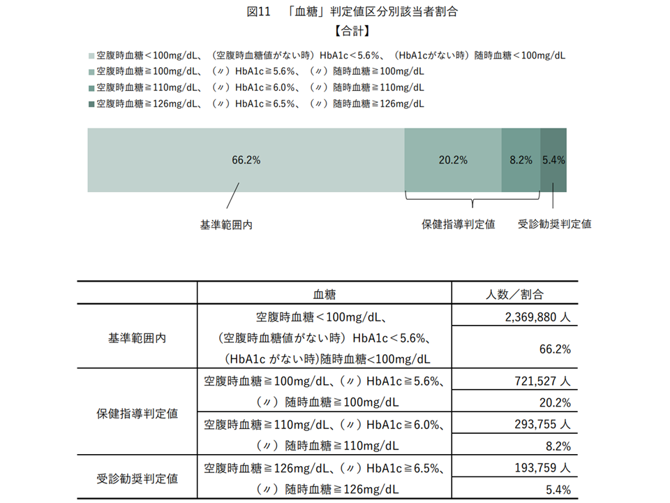 血糖に関しては、66.2%が基準範囲内(空腹時血糖100mg/dL未満、HbA1c5.6%未満)ですが、▼28.4%が「保健指導判定値」以上(空腹時血糖100mg/dL以上、HbA1c5.6%以上が20.2%、空腹時血糖110mg/dL以上、HbA1c6.0%以上が8.2%)▼5.4%が「受診勧奨判定値」以上(空腹時血糖126mg/dL以上、HbA1c6.5%以上)—となりました。