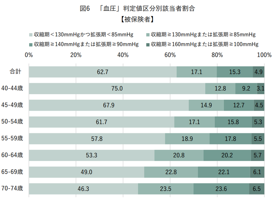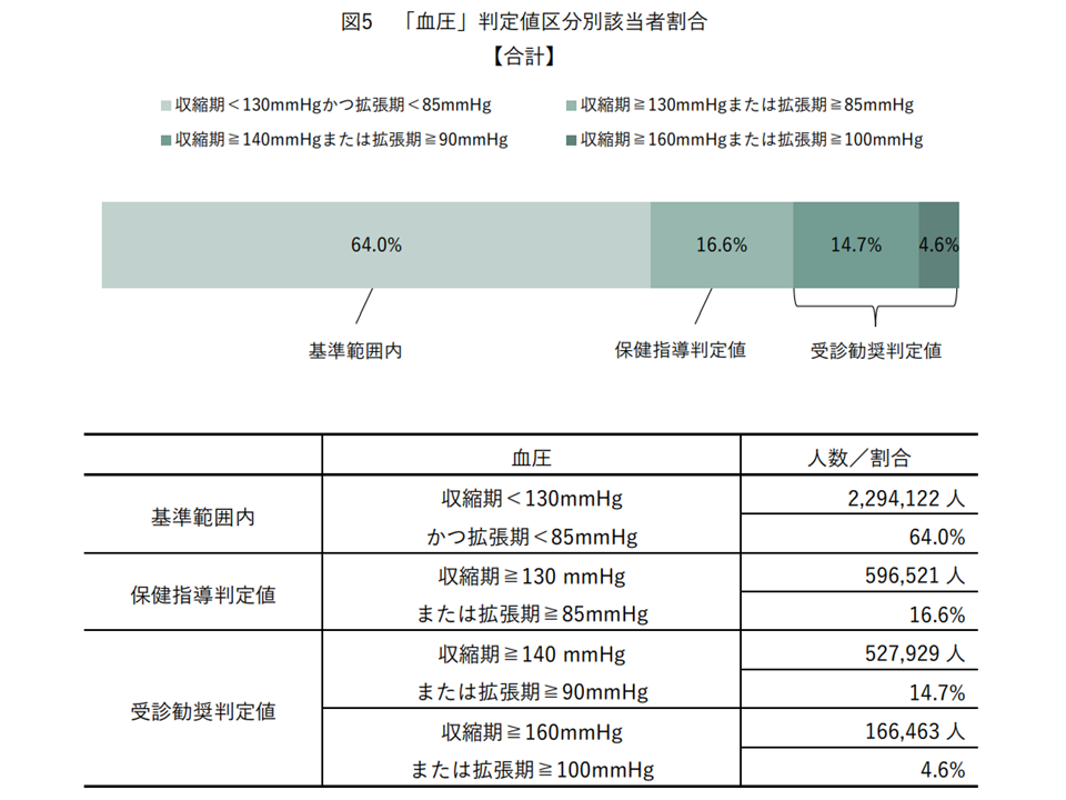 次に血圧の状況を見てみましょう。全体の64.0%は基準範囲内(収縮期130mmHg未満・拡張期85mmHg未満)ですが、▼16.6%が「保健指導判定値」以上(収縮期130mmHg以上・拡張期85mmHg以上)▼19.4%が「受診勧奨判定値」以上(収縮期140mmHg以上・拡張期90mmHg以上が14.7%、収縮期160mmHg以上・拡張期100mmHg以上が4.6%)—という状況です。