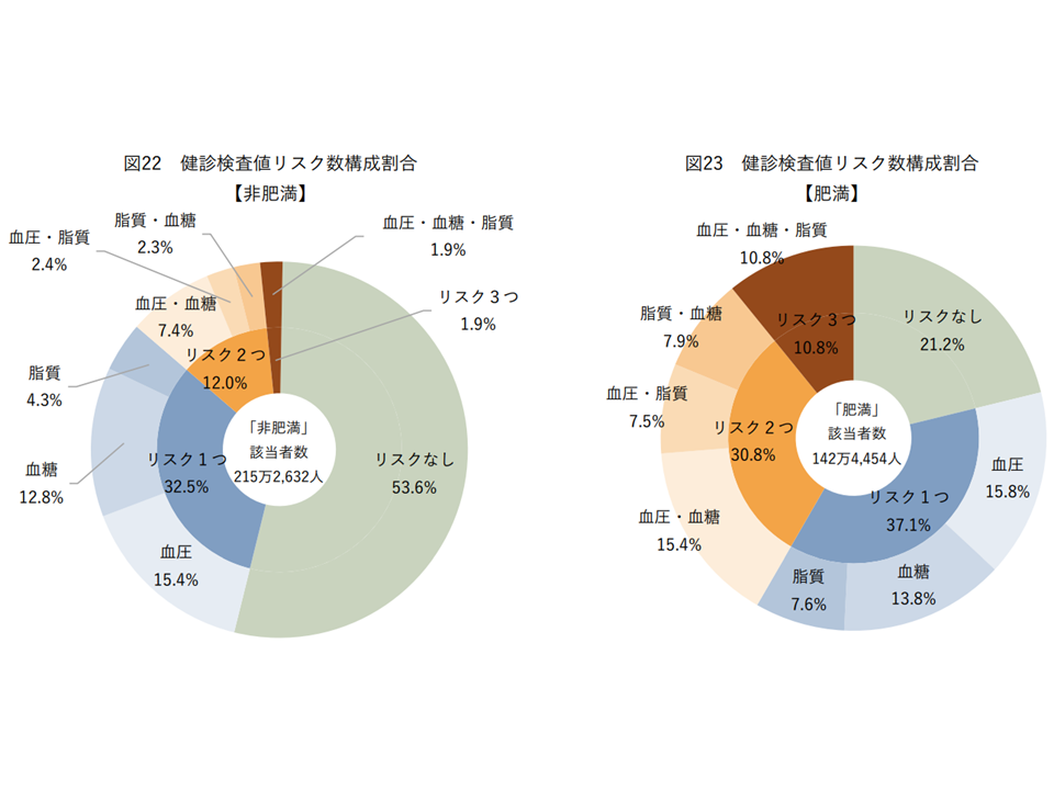 肥満者と非肥満者とで、血圧や脂質、血糖などの健康リスク保有者の割合を比べると、非肥満者では「保健指導判定値以上」は46.4%にとどまりますが、肥満者では78.8%と大多数が「保健指導判定値以上」という状況です。またリスクの内容を見ると、肥満者では複合的な健康リスク保有者が多いことも改めて確認できます。