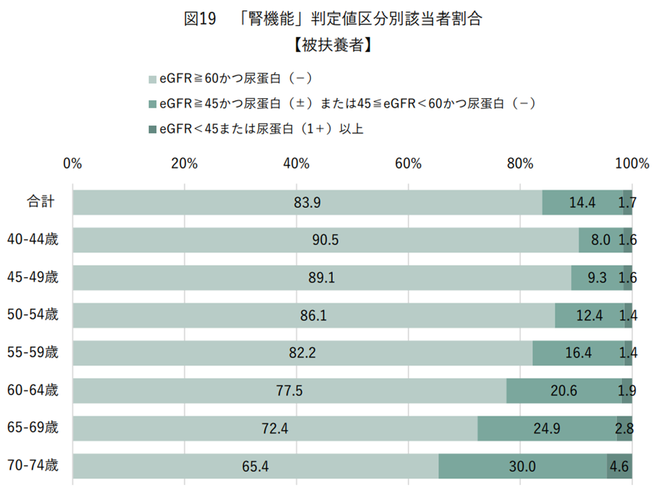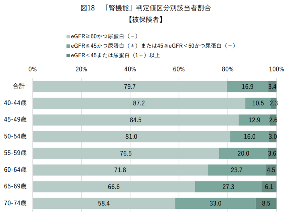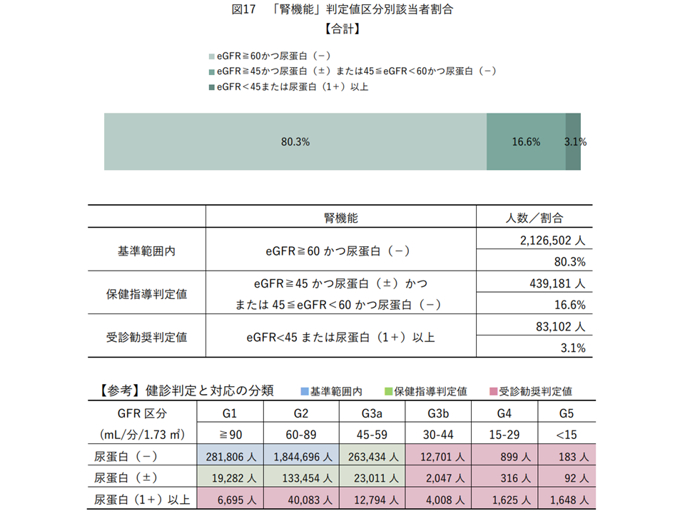 腎機能に関しては、80.3%が基準範囲内(eGFR値が60以上、かつ尿蛋白マイナス)ですが、▼16.6%が「保健指導判定値」以上(eGFR値が45以上かつ尿蛋白プラスマイナス、またはeGFR値が45以上60未満かつ尿蛋白マイナス)▼3.1%が「受診勧奨判定値」以上(eGFR値が45未満または尿蛋白が1+以上)—となりました。