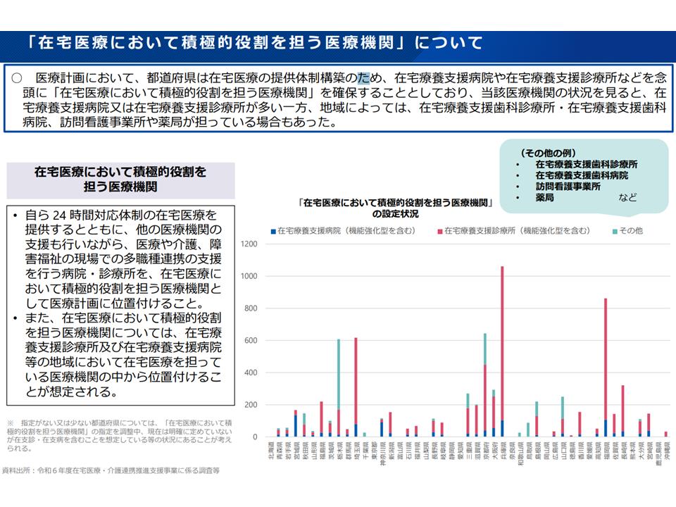 ・【在宅医療において積極的役割を担う医療機関】については、「在宅療養支援診療所」「在宅療養支援病院」などの「地域において在宅医療を担っている医療機関」の中から位置付けることが想定される
