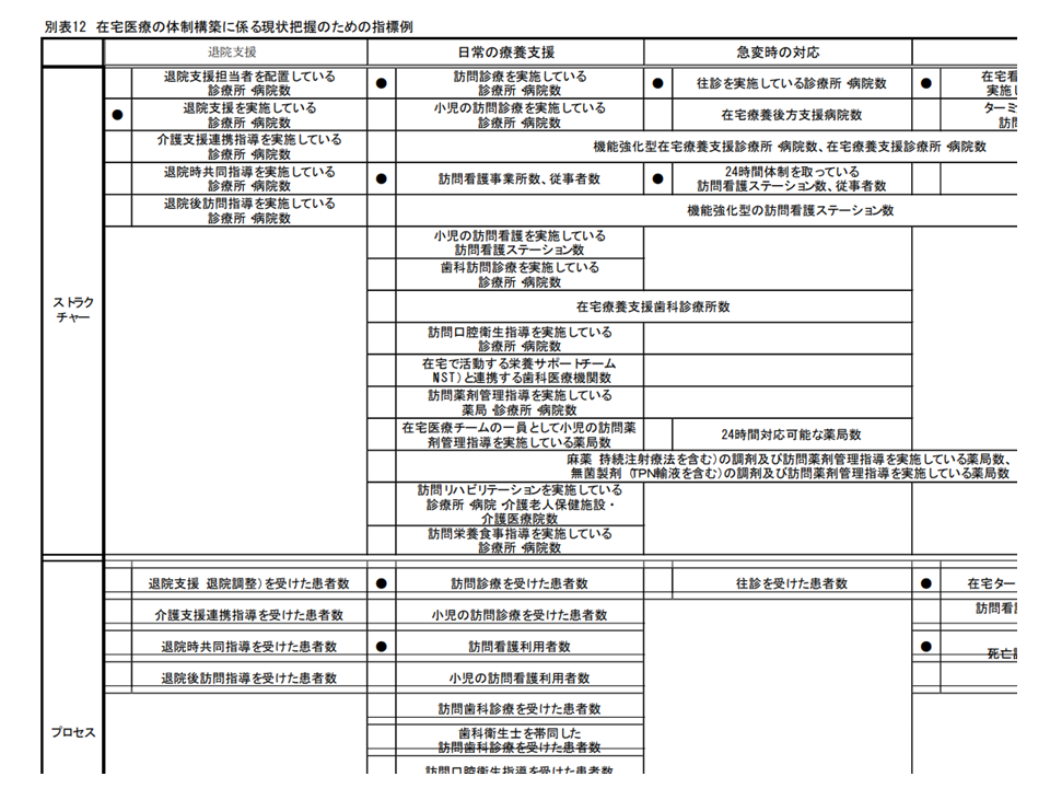 ところで、指針には「在宅医療の体制構築」を評価する指標も盛り込まれています。例えば「退院支援を実施している診療所・病院数は何か所整備されているのか」「訪問診療を実施している診療所・病院数は何か所整備されているのか」などを各都道府県でチェックし、他の都道府県と比較することで、「自地域における在宅医療の整備度合いは進んでいるのか、遅れているのか」を客観的に把握でき、「他地域と比べた自地域の弱点は●●なので、この部分を重点的に整備していこう」等の改善につなげることができます。
