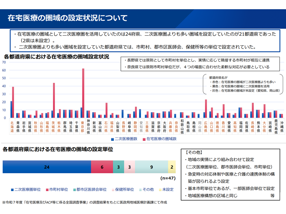 現在の在宅医療圏域の状況を見ると、▼2次医療圏単位:24府県▼市町村単位・医師会単位など「より狭いエリア」を設定:21都道県▼設定なし:2県—となっています。