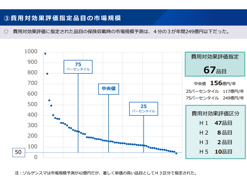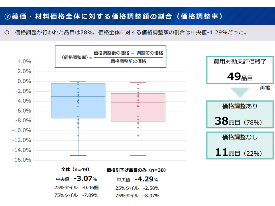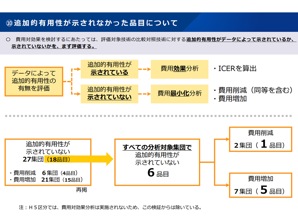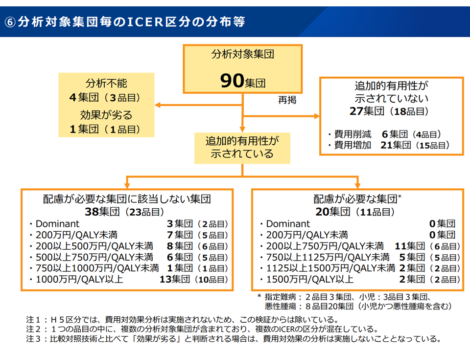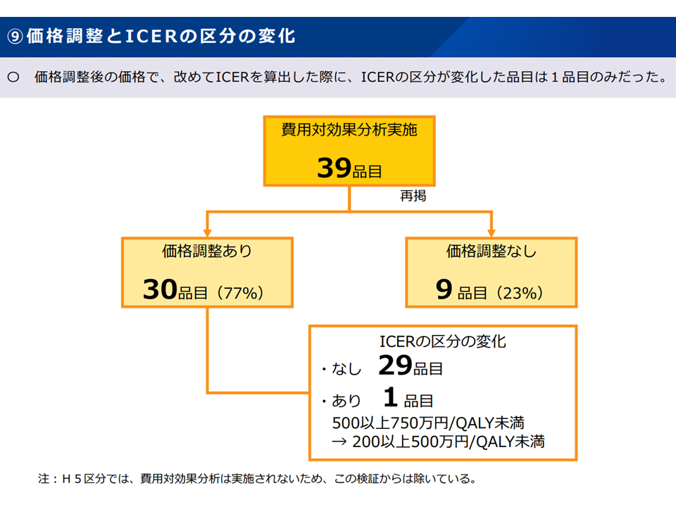 ▽価格調整後の価格で、改めてICER(増分費用効果比、効果を上げるためにどの程度の費用がかかるかを示すもので「値が小さいほど費用対効果が優れている」と言える)を算出した際に、ICERの区分が変化した品目は1品目のみであった(費用対効果が向上した)