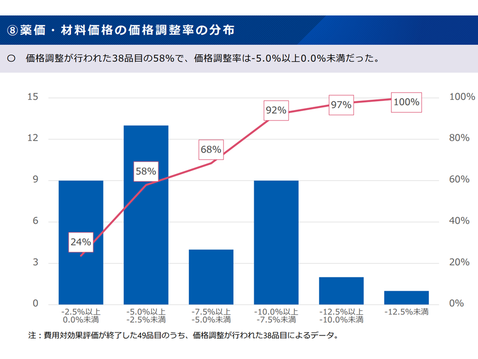 費用対効果評価制度に基づき価格調整が行われた38品目の「製品価格全体に対する価格調整額の割合」は中央値でマイナス4.29%―中医協