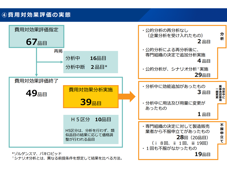 高額な医薬品・医療機器などについては、価格(費用)が治療効果に見合っているのかを、既存治療法などと比較して判断する【費用対効果評価】が行われているが、これまでに67品目が費用対効果評価の対象となり、うち49品目で費用対効果評価が終了し、そのうち39品目で「費用対効果分析」が行われた—。
