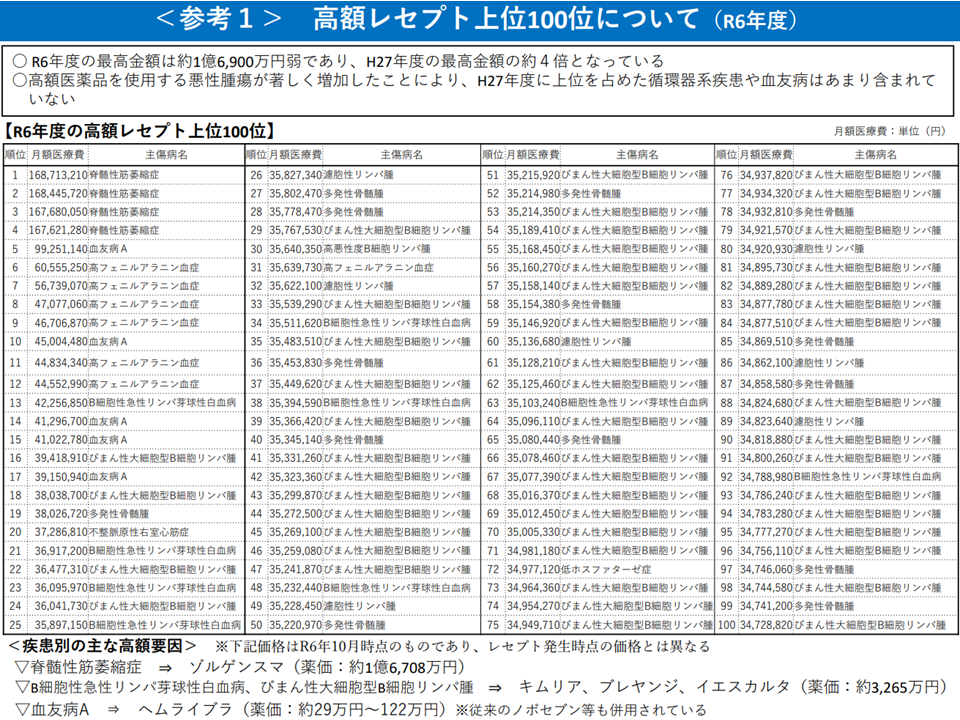 また、昨年度(2024年度)における上位100疾患のリストに目を移すと、最高額のレセプトは脊髄性筋萎縮症の患者で1か月当たり「1億6871万3210円」でした。また、2020年度、21年度、22年度、23年度と同様に第1位から第4位まで「脊髄性筋萎縮症」患者が占めており、それぞれ「1億7000万円程度」の高額レセプトが発生しています。