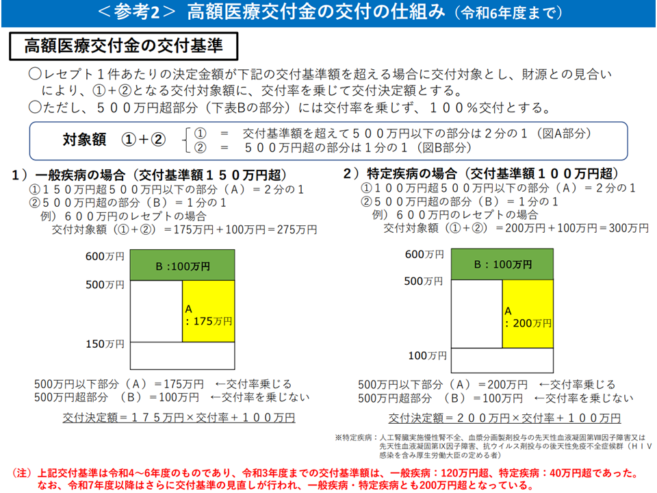 ところで、こうした高額レセプトが発生した場合、健保組合の財政が一時的に苦しくなることがあります。とりわけ小規模な健保組合では、1件でも高額レセプトが発生した場合、財政に大きな影響が出がちです。そこで健保連では、いわば「再保険」とも言える仕組みを用意しています。具体的には保険料の一部をプールし、高額レセプト(2024年度は一般疾病では150万円超、血友病などの特殊疾病では100万円超)が発生した健保組合に対して、基準額(同)を超過した分が交付されます(高額医療交付金交付事業)。