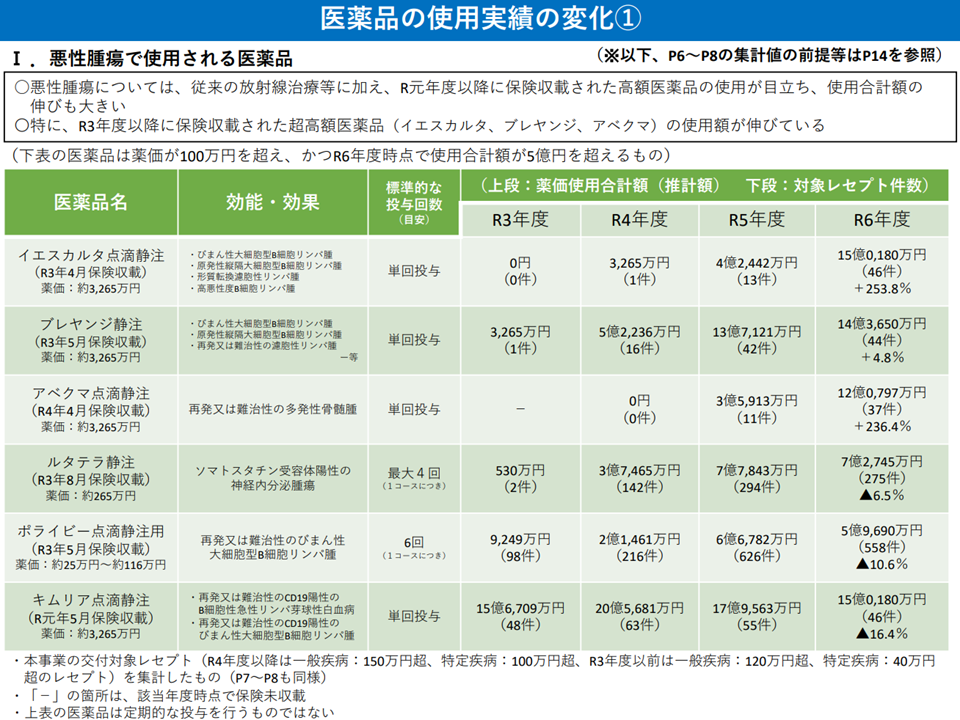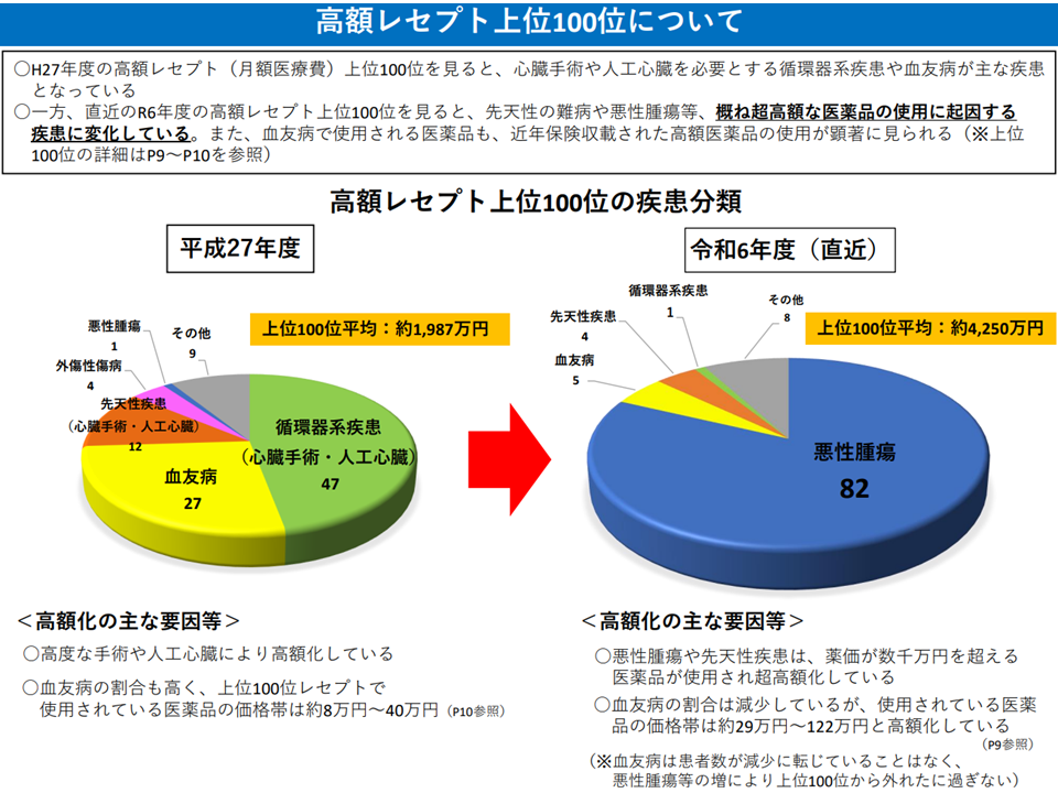 長期的に見ていく必要がありますが、上述のように上位100件の高額レセプトの「疾病構成」について、「悪性腫瘍」が大幅に増加する(2019年度はゼロ件→2020年度は24件→2021年度は49件→2022年度は79件→2023年度は74件→2024年度は82件)など、その顔ぶれに大きな変化が生じていることが確認できます。
