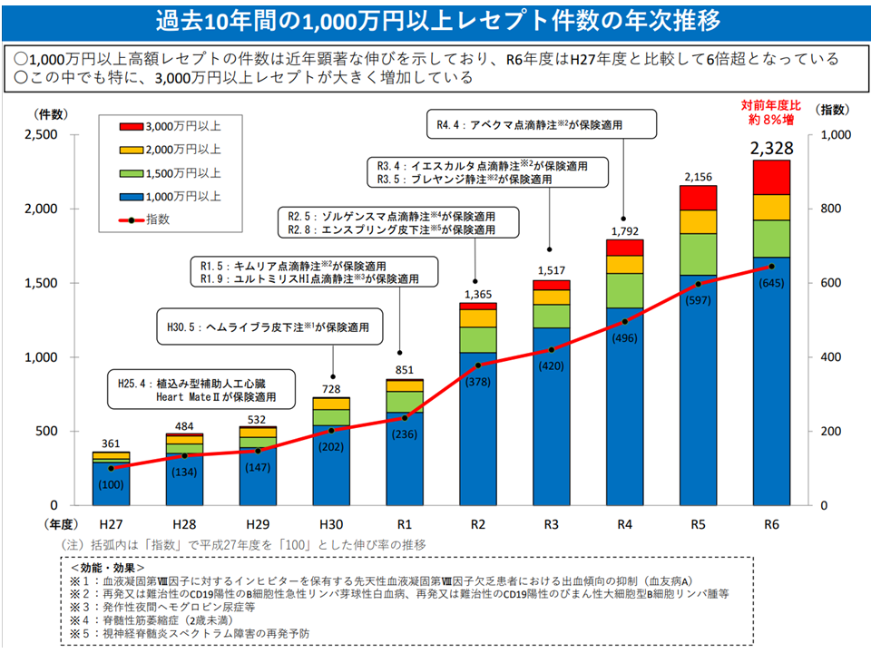 1000万円以上の高額レセプトは昨年度(2024年度)には2328件発生し、過去最高を更新しました。最近の状況を見ると、次のようにハイペースで増加し続けていることが分かります。