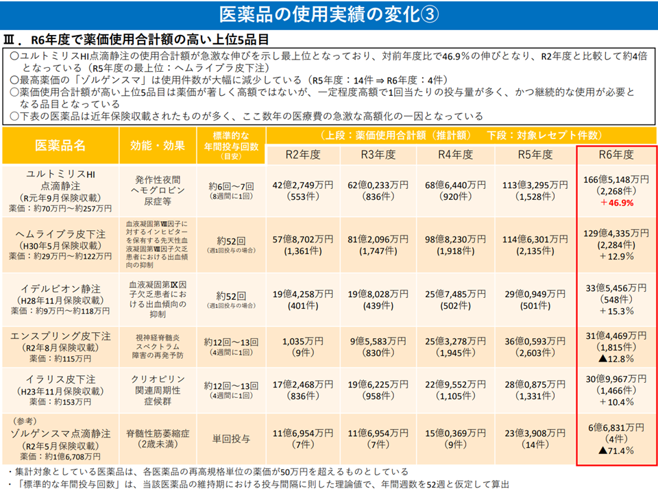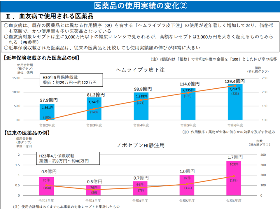 健保連では、▼2024年度における1000万円以上レセプトの件数は「10年前(2015年度)に比べて6倍超に増加」している▼高額レセプト上位100位の高額化の要因を見ると、10年前は「心臓手術」や「人工心臓」を要する循環器系疾患や血友病が主な疾患であったが、直近では「先天性の難病」や「悪性腫瘍」など、概ね超高額な医薬品(脊髄性筋萎縮症の治療薬「ゾルゲンスマ点滴静注」、画期的な抗がん剤「イエスカルタ点滴静注」や「ブレヤンジ静注」等)の使用に起因する疾患へと変化している▼超高額ではないものの、一定程度高額かつ投与量が多く、継続的な使用が必要となる医薬品(発作性夜間ヘモグロビン尿症の治療に用いる「ユルトミリス点滴静注HI点滴静注」、先天性血友病の治療に用いるヘムライブラなど)で使用額が高くなる傾向が見られた—ことなどを紹介しています。