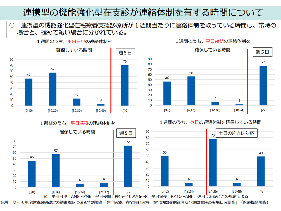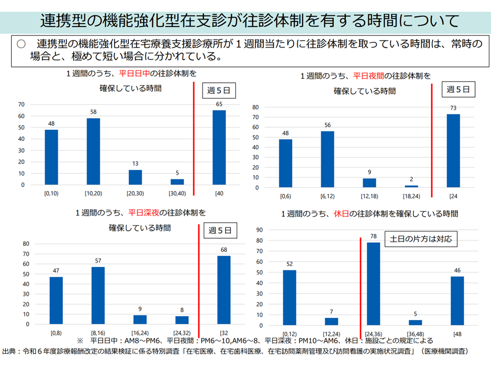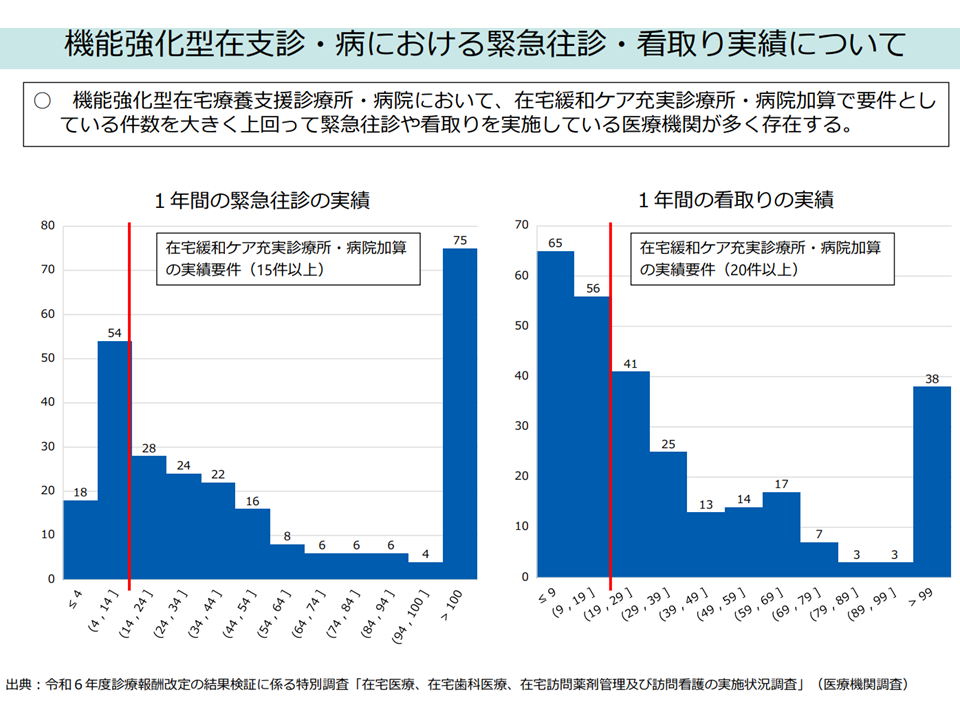 こうした状況を踏まえると、やはり「より積極的な取り組みを行っている医療機関」には相当の高い評価で応えるべきと考えられます。林医療課長は「地域の24時間往診体制への貢献の度合い」に応じて、よりきめ細かく評価してはどうか、との論点を提示しています。
