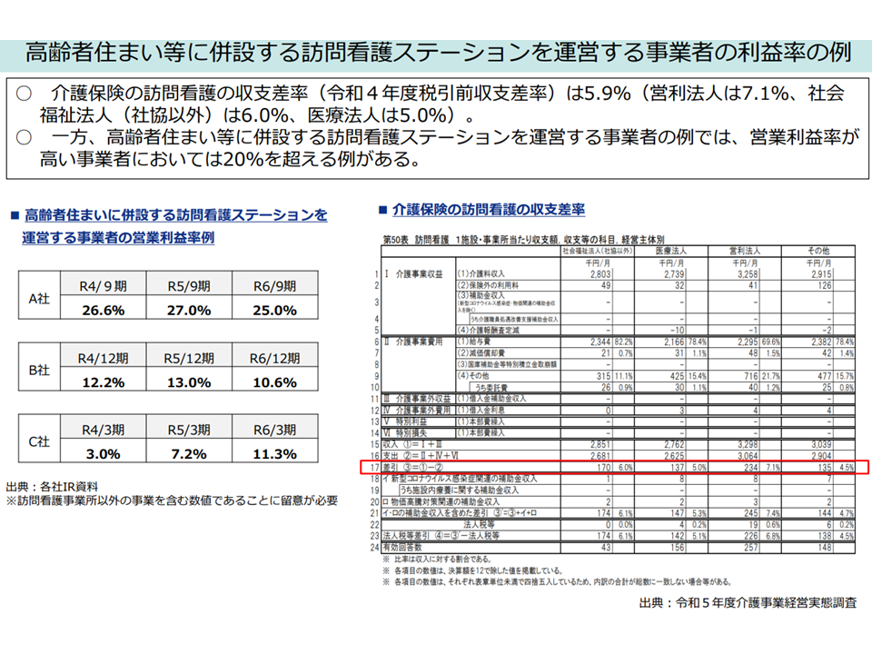 ▽介護保険の訪問看護の収支差率(2022年度税引前収支差率)は5.9%であるが、「高齢者住まい併設訪問看護ステーション」では、中には営業利益率20%超もある