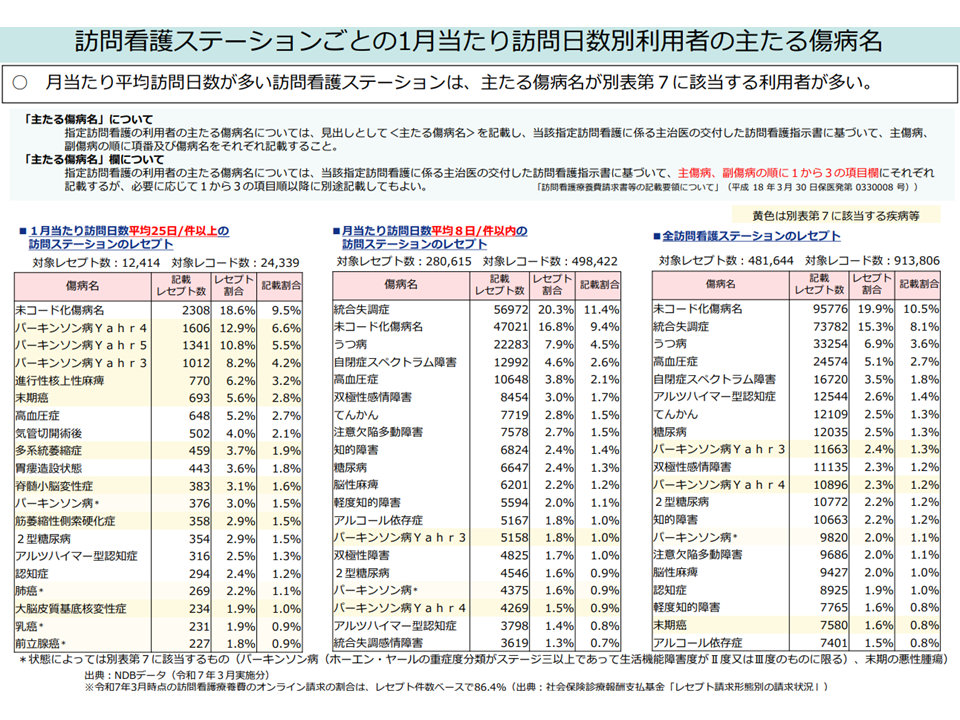 これに対し診療側の江澤委員は、▼厚労省提案は「訪問回数が多い訪問看護の適正化」などに偏っている。訪問回数の多い訪問看護では、パーキンソン病やALS(筋萎縮性側索硬化症)などの重症患者(いわゆる別表7に該当する患者など)が多い点(下図表)を勘案すべきである▼一部の特殊な高額請求事例を見た適正化を行えば、多くの真面目な訪問看護ステーションに悪影響が出てしまう▼不適切な請求については、まず指導等で対応すべきである▼医師が訪問看護を指示する時点では「頻回な訪問看護の必要性」は必ずしも明らかではない。患者の状態は短時間で変化するため、指示書に「頻回な訪問」記載を求めることは難しい—と厚労省提案を批判。