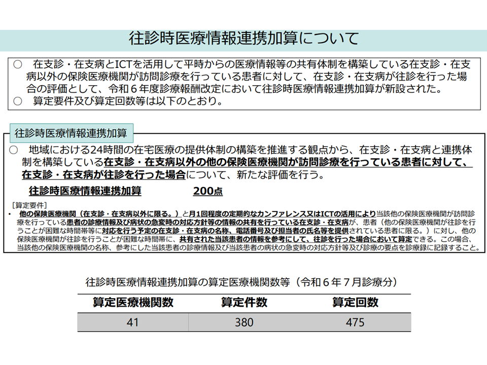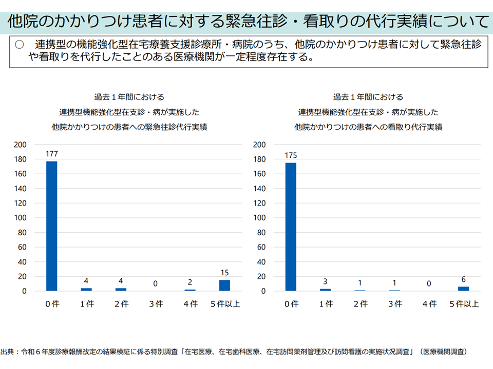また2024年度の前回診療報酬改定では、地域における24時間の在宅医療提供体制を構築するために「在支診・病と連携体制を構築している『在支診・在支病以外の他医療機関』が訪問診療を行っている患者」に対し、在支診・病が往診を行うことを【往診時医療情報連携加算】として評価しました。例えば「在支診・病でないA医療機関」が訪問診療を行っているかかりつけ患者Xの容態が悪化したが、A医療機関の医師が学会出張などで対応できない。このため他の在支診・病であるB医療機関から患者Xの往診に行く」場合などが想定できます(関連記事はこちら)。