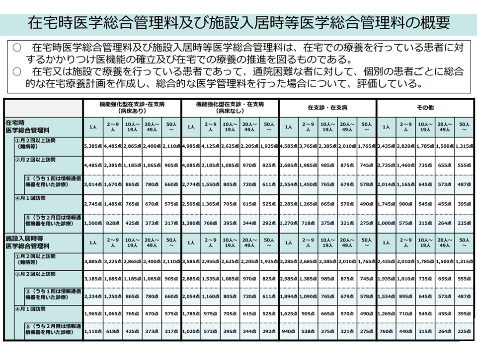 在宅療養患者の診療報酬は、大きく▼都度都度の訪問を評価する在宅患者訪問診療料等▼長期療養に関して「総合的な医学管理」を評価する在医総管・施設総管—にわけることができます。