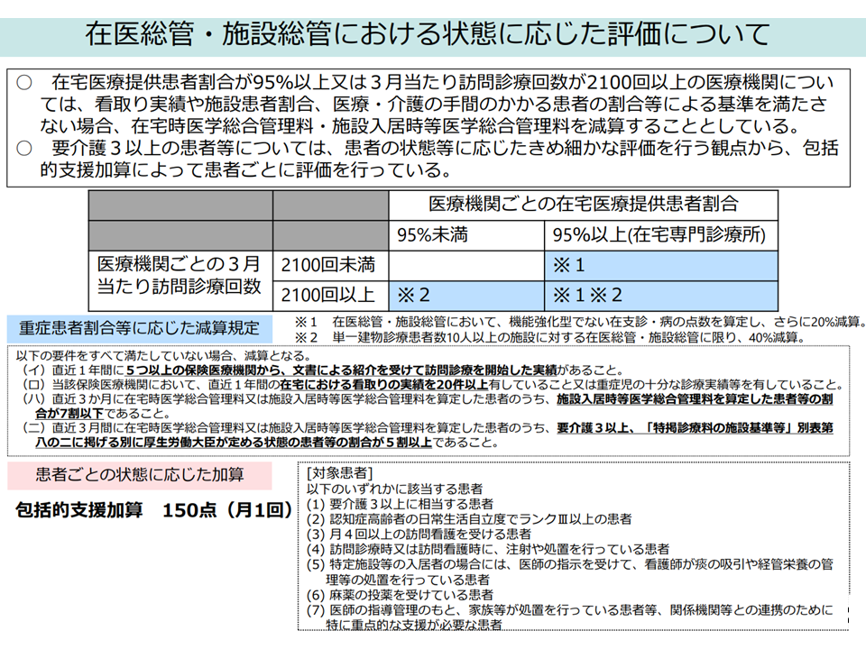 後者の「総合的な医学管理」を評価する在医総管・施設総管は、▼医療機関の体制(医療機関が機能強化型の在支診・病などか否か)▼訪問診療の頻度(言わば患者の医療必要度)▼患者の居住状況(訪問の効率性)—を軸に点数が区分されています。