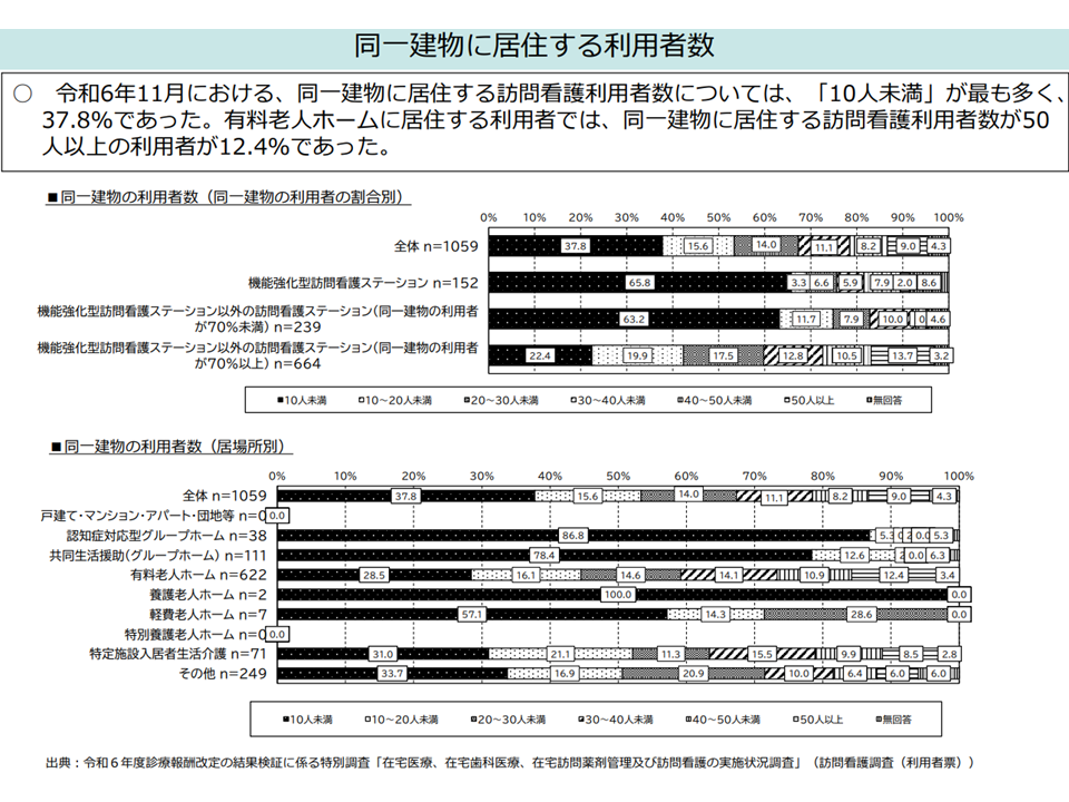 ▽「同一建物に居住する訪問看護利用者数」(2024年11月)は、「10人未満」が最も多いが、有料老人ホーム居住の利用者では「50人以上」が12.4%もある