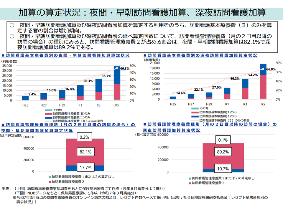 ▽同一建物居住者に対する訪問看護については算定回数・算定割合ともに増加しており、複数名訪問看護加算、難病等複数回訪問加算、夜間・早朝訪問看護加算、深夜訪問看護加算、緊急訪問看護加算を算定している利用者のうち「訪問看護基本療養費(II)のみを算定する利用者」の割合が増加傾向にある