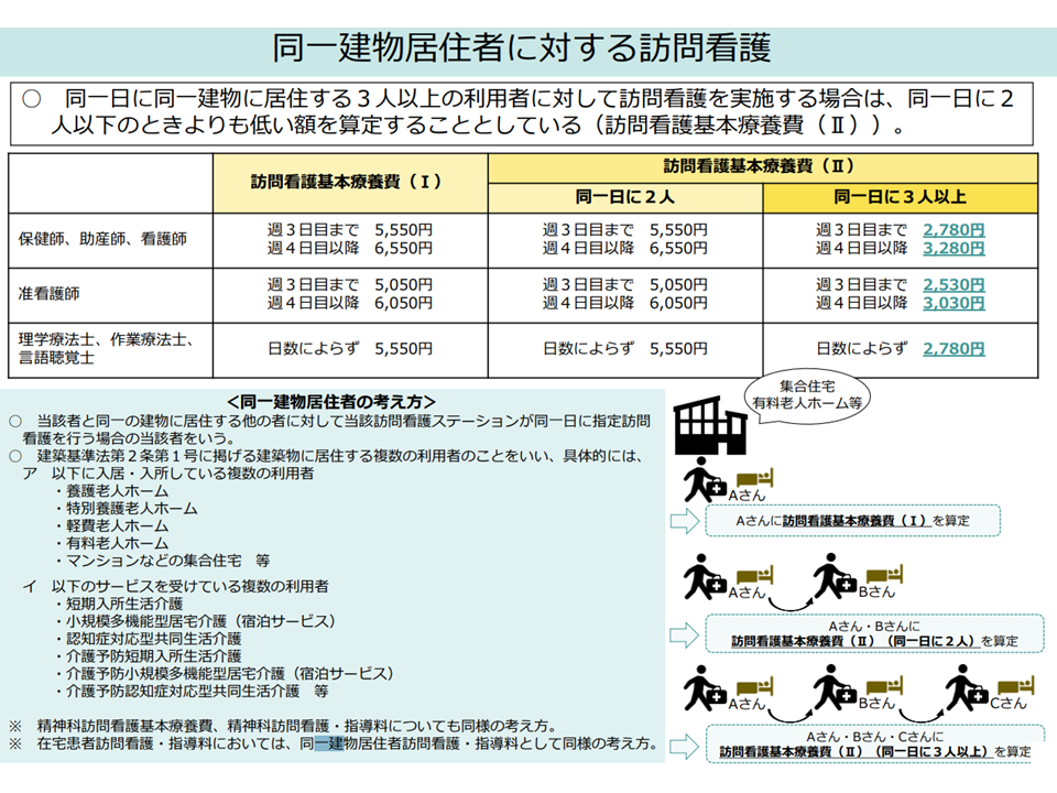 訪問看護については、例えば高齢者施設(有料老人ホームなど)に居住する複数の高齢者に同一日に訪問看護を提供できれば、移動コストが大幅に縮減でき、効率的な訪問看護を行えるため、訪問看護基本療養費(都度都度の訪問を評価する療養費)は「同一日に同一建物に居住する『3人以上』の利用者への訪問」を少し低く評価しています(訪問看護基本療養費III、2人までは同じ金額)。