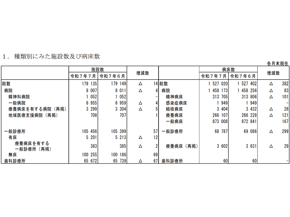このうち病院の施設数は8007施設で前月末から4施設減少。種類別に見ると、▼一般病院:6955施設(前月末から4施設減)▼精神科病院:1052施設(同増減なし)—となりました。一般病院のうち「療養病床を有する病院」は3299施設で前月末から5施設減少、「地域医療支援病院」は708施設で前月末から1施設増加しています。
