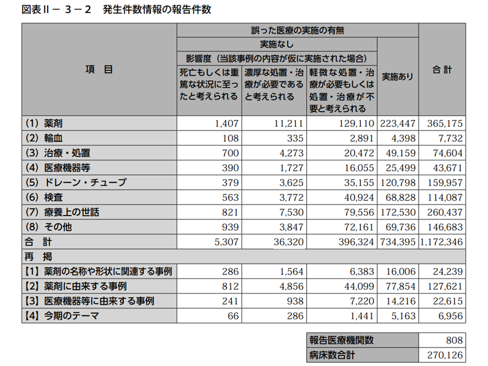 「ヒヤリとした、ハットした」にとどまり、実際に患者に誤った行為などをしていないケースが全体の4割近く(43万7951件)あります。これらについて、「仮に誤った行為を実施してしまった」場合の影響を推測すると、「死亡」もしくは「重篤な状況」に至ったであろう重大なミスは5307件・1.2%(前年から0.4ポイント減)、「濃厚な処置・治療が必要になった」と思われる中程度のミスは3万6320件・8.3%(同0.6ポイント増)となっています。一歩間違えば大きな事故に至った事例も少なくなく、「個々人の十分な注意」とともに、「1人がミスをしても他者が気づき、リカバリーできる体制づくり」などの重要性がさらに増していくと考えられます。