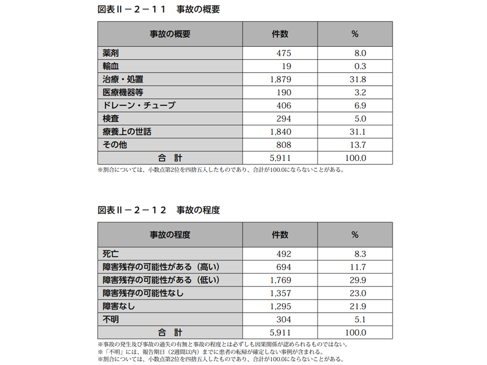 医療事故の概要を見てみると、最も多いのは「治療・処置」で1879件(事故全体の31.8%、前年から0.1ポイント減少)。次いで「療養上の世話」の1840件(同31.1%、同増減なし)、「薬剤」の475件(同8.0%、同0.1ポイント減)、「ドレーン・チューブ」の406件(同6.9%、同1.2ポイント減)などと続きます。従前と同様に「治療・処置」に関する事故がシェアチップを占めていますが、医療行為全般について「再発防止策の徹底」が求められます。