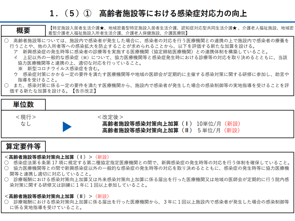 このため2024年度介護報酬改定では、(介護予防)特定施設入居者生活介護、地域密着型特定施設入居者生活介護、(介護予防)認知症対応型共同生活介護、介護老人福祉施設、地域密着型介護老人福祉施設入所者生活介護、介護老人保健施設、介護医療院を対象とした【高齢者施設等感染対策向上加算】が設けられました。