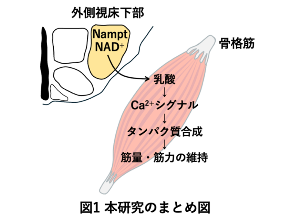 サルコペニアの発症に脳(外側視床下部)の【NAD+】代謝が密接に関わっている。より具体的には、脳(外側視床下部)の【NAD+】代謝を起点とした脳-骨格筋連関があり、脳骨格筋連関は骨格筋内の解糖系(乳酸)に作用し、筋機能を制御している—。