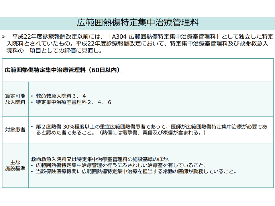 「救命救急入院料1-4」「特定集中治療室管理料1-6」が「広範囲熱傷特定集中治療管理料」の有無によって区分が分かれているが、診療報酬点数簡素化の観点からどのように考えるか(例えば「広範囲熱傷特定集中治療管理料」を「特定集中治療室管理料の加算」とすることなどが検討できないか)
