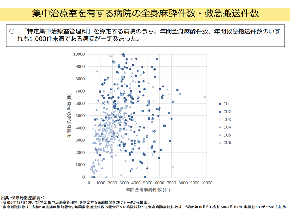 こうしたデータを見ると、ICUの施設基準に、新たに「当該【病院】における年間救急搬送受け入れ件数や全身麻酔手術件数等の基準を盛り込む」ことなどが考えられそうです。