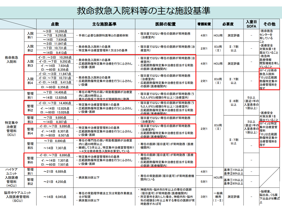 またICU等における「医師配置要件」も注目される論点です。2024年度の前回診療報酬改定では「宿日直許可を得た医師を配置するICU等を評価する低い点数区分(ICU5・6等)」が設けられました(関連記事はこちら)。
