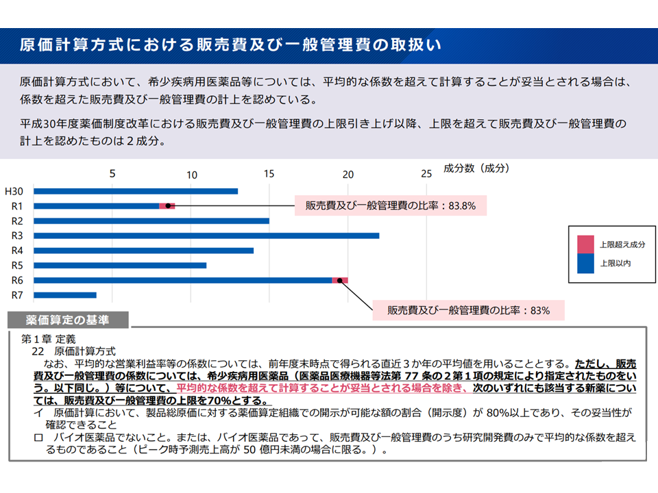 ▽原価計算方式における販売費・一般管理費の計上には70%の上限を設けている。特例で「上限を超過する」ことも可能であるが、特例は過去には2品目にとどまり、その場合でも「80%程度」と限定されているが、この取り扱いをどう考えるか