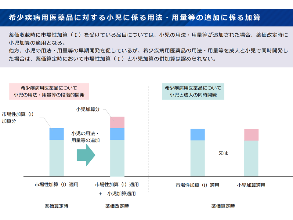 →希少疾病用医薬品の開発の後に小児の用法・用量等が追加された場合は、収載時の市場性加算(I)と改定時の小児加算がそれぞれ適用となる