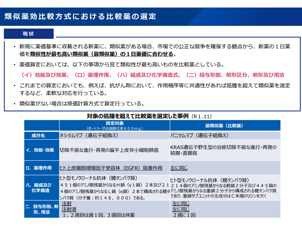 ▽類似薬効比較方式(新薬の薬価は最も類似する医薬品の1日薬価と等しくなるように設定する)における革新的新薬の評価方法(比較薬(類似薬)の判断基準拡大を含めて)について「医療上の必要性が高い⾰新的医薬品に対する薬価上の評価指標の開発に資する研究」が行われており、この研究結果を踏まえて「類似性の判断」等を議論してはどうか
