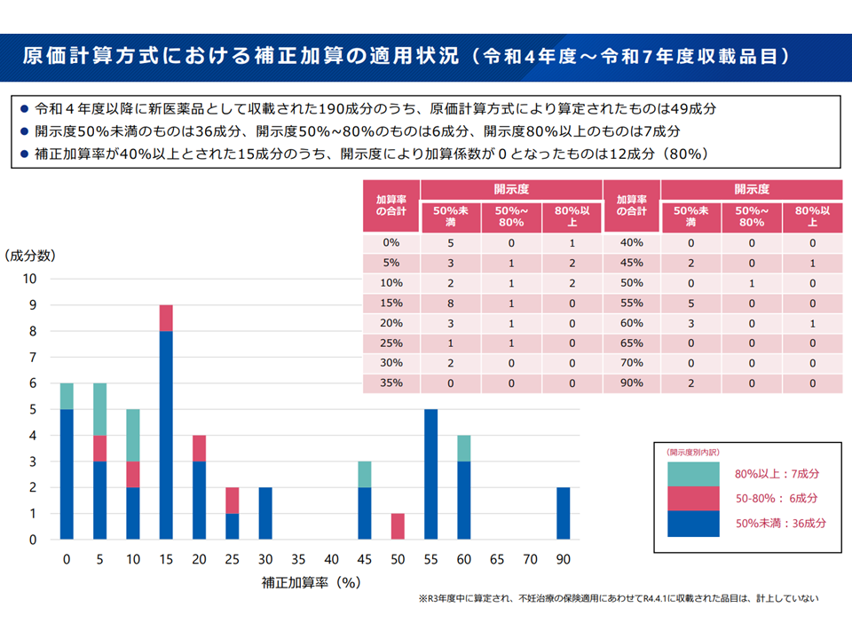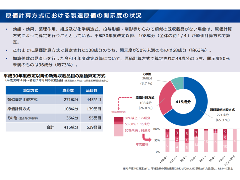 ▽原価計算方式(類似薬がない場合に原価を積み上げて薬価を設定する)においては「加算を行う場合、原価の開示度に応じた加算率」を設定し、開示度80%以上の場合は1.0(つまり100%の加算を行う)、50%以上80%未満の場合は0.6(同60%の加算を行う)、50%未満の場合はゼロ(つまり加算は行わない)とされている。この点、医薬品のサプライチェーンの複雑化により原価の詳細な開示が難しくなっている状況などを踏まえた検討を行ってはどうか