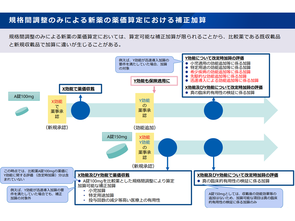 →規格間調整のみによる薬価算定において適用可能な補正加算は限られ、市場性加算(I)・先駆加算・迅速導入加算は認められていない
