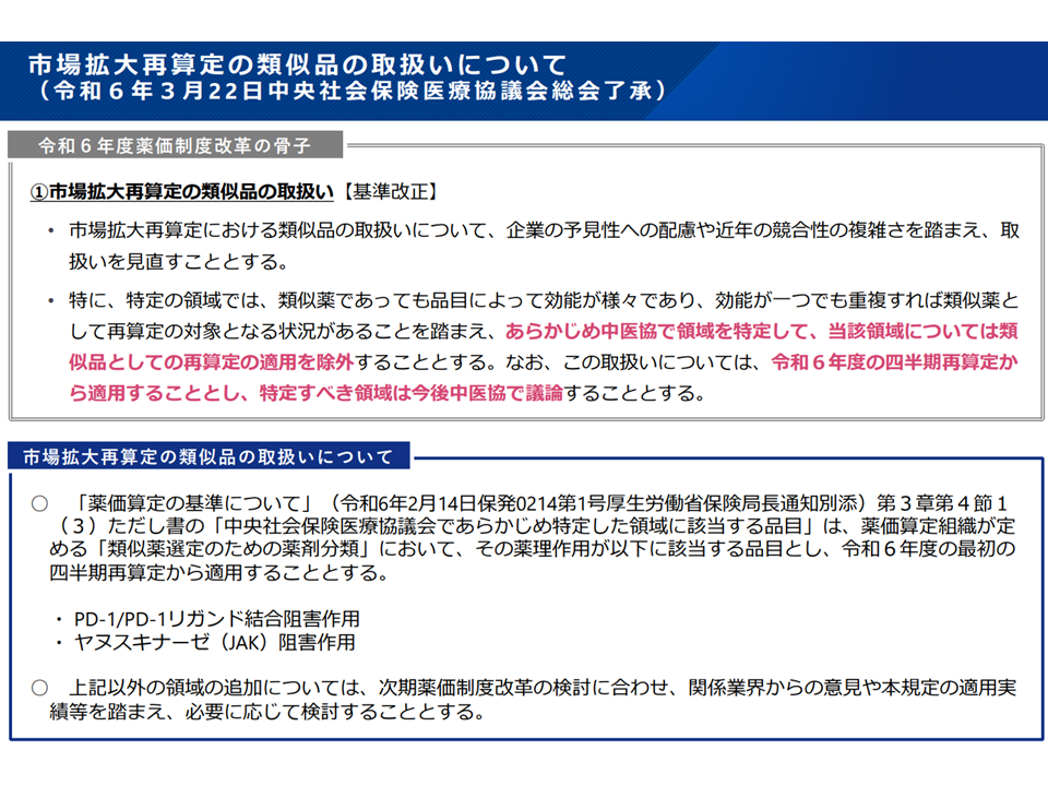 →2024年度薬価制度改革で「中医協であらかじめ特定した領域に該当する品目は類似品として取り扱わない」こととした点を踏まえ、市場拡大再算定の類似品の取り扱いをどう考えるか(通常は類似品も同じく価格引き下げを行っている)