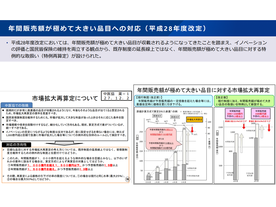 2026年度の薬価制度改革に向けて、イノベーション評価をどう進めるべきか。例えば「市場が予想をはるかに超えて大きくなった」という点のみに着目して薬価を引き下げる「市場拡大再算定の特例ルール」の是非をどう考えるか—。