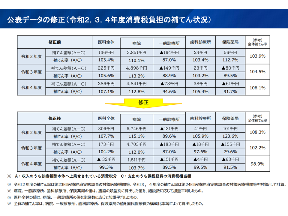 ▽物価高騰などを踏まえて「医療機関等における控除対象外消費税の補填」(診療報酬の特別プラス改定による補填)状況を調査していく(調査手法などは従前の取り扱いを維持する、関連記事はこちら)(なお、2023年度・24年度の補填状況調査において一部誤りのあることが判明した。修正前後でも補填率は「概ね100%」であるが、中医協委員からは「極めて遺憾」との批判多数)