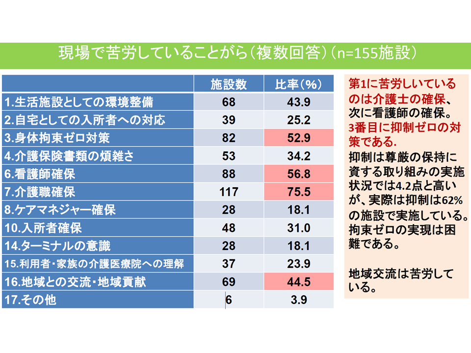 また、現場で苦労している事項としては、▼介護職員の確保(75.5%)▼看護師の確保(56.8%)▼身体拘束ゼロ(52.9%)—などが上位にあがっています。