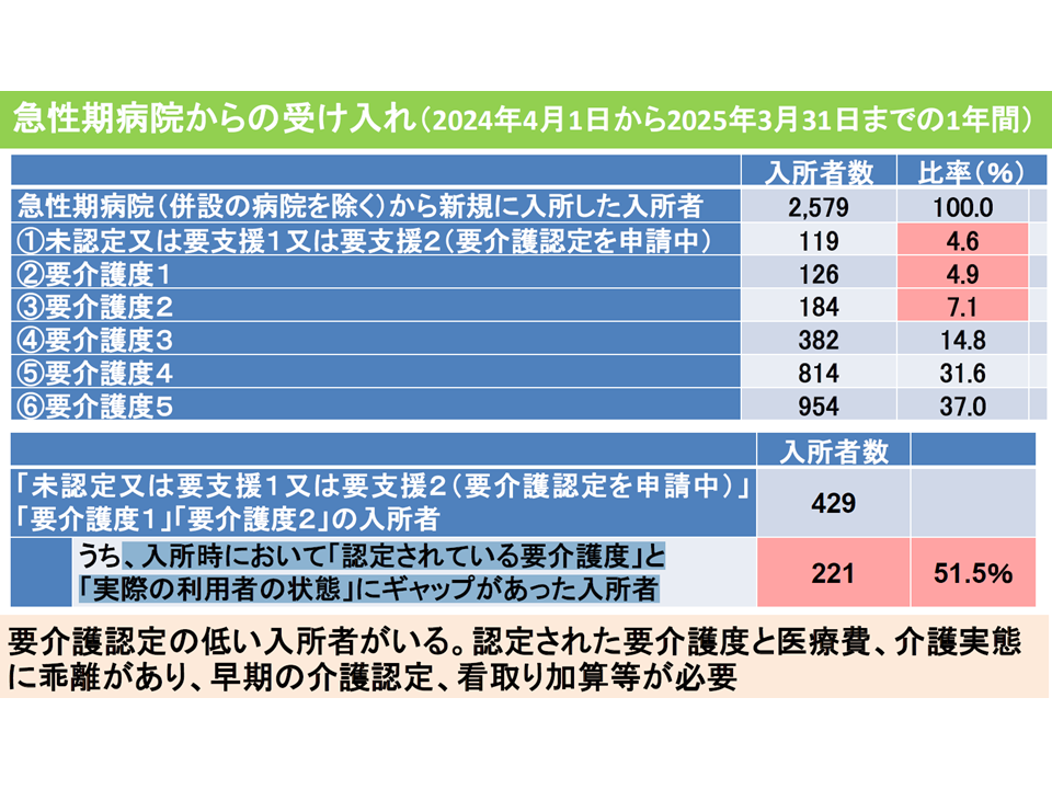 次に、急性期病棟からの受け入れ状況を見ると、2024年4月から2025年3月までの1年間に2579名で、いわゆる「軽度者」とされる要介護2以下が16.6%(429名)でした。このうち、「入所時に認定されている要介護度」と「実際の利用者の状態」との間にギャップがあった(例えば「要介護1」として入所したが、実態は要介護3・4相当であるなど)入所者は51.5%(221名)に上りました(急性期病棟からの入所者全体の8.6%)。