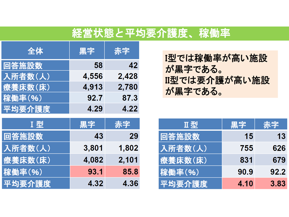 ▽黒字施設は赤字施設に比べて「I型では稼働率が高い」(黒字93.1%、赤字85.8%)、「II型では要介護度が高い」(黒字4.10、赤字3.83)という特徴がある
