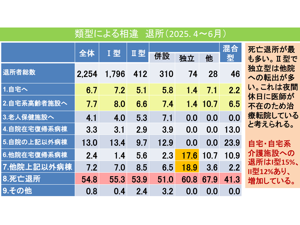 また、II型(「転換老健」並みの人員配置)の独立型(医療機関に併設でない)施設では「他院の在宅復帰系施設」や「他院(上記以外病棟)」への退所が多くなっています(下図表の橙色部分)。この点について鈴木会長は「II型・独立型施設には夜間に医師が常駐していないため、状態が悪化した場合に他医療機関等へ移る傾向がある。I型(従前の「機能強化型介護療養」並みの人員配置)では夜間にも医師が常駐しており、一定程度、状態が悪化しても自施設で対応可能である」とコメントしています。
