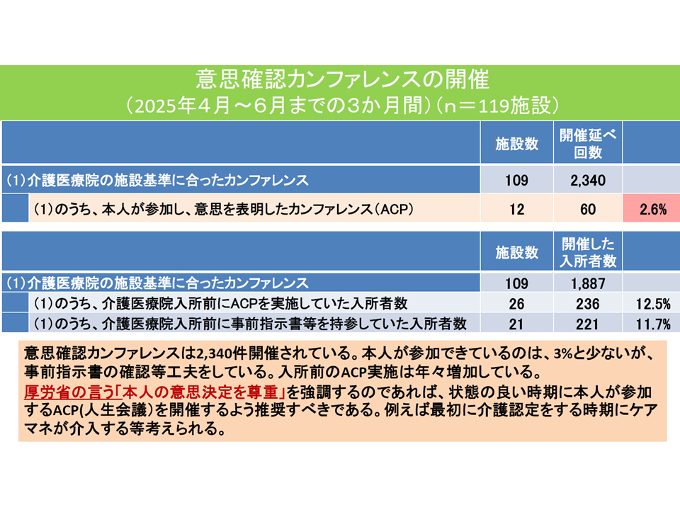他方、本年(2025年)4-6月における「介護医療院の施設基準に合った意思確認カンファレンス」の開催状況を見ると「2340回」ありますが、そこに「入所者本人の参加」があったケースはわずか2.6%にとどまっています。