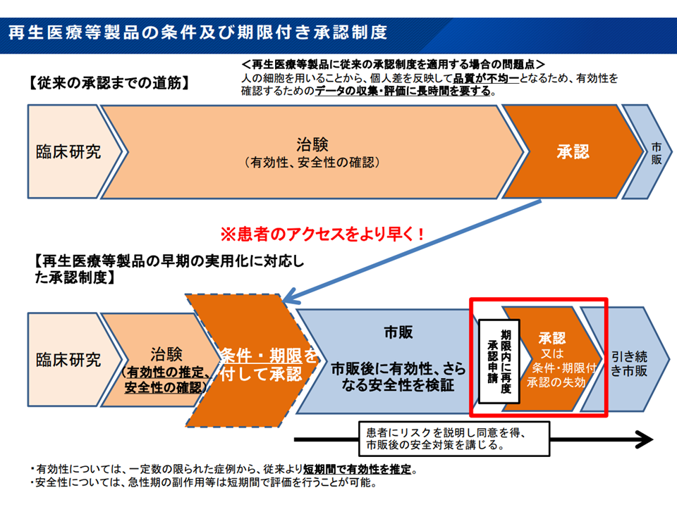 「最新の優れた医療技術に対する患者のアクセスを確保する」ことを目指す優れた仕組みですが、条件・期限付き承認を受けた「再生医療等製品」の中には、有効性・安全性を確認できず「取り下げ→保険適用からの削除」となるものが続けて2例現れてしまいました(慢性動脈閉塞症等治療に用いる「コラテジェン筋注用」、重症心不全治療に用いる細胞シート「ハートシート」)。